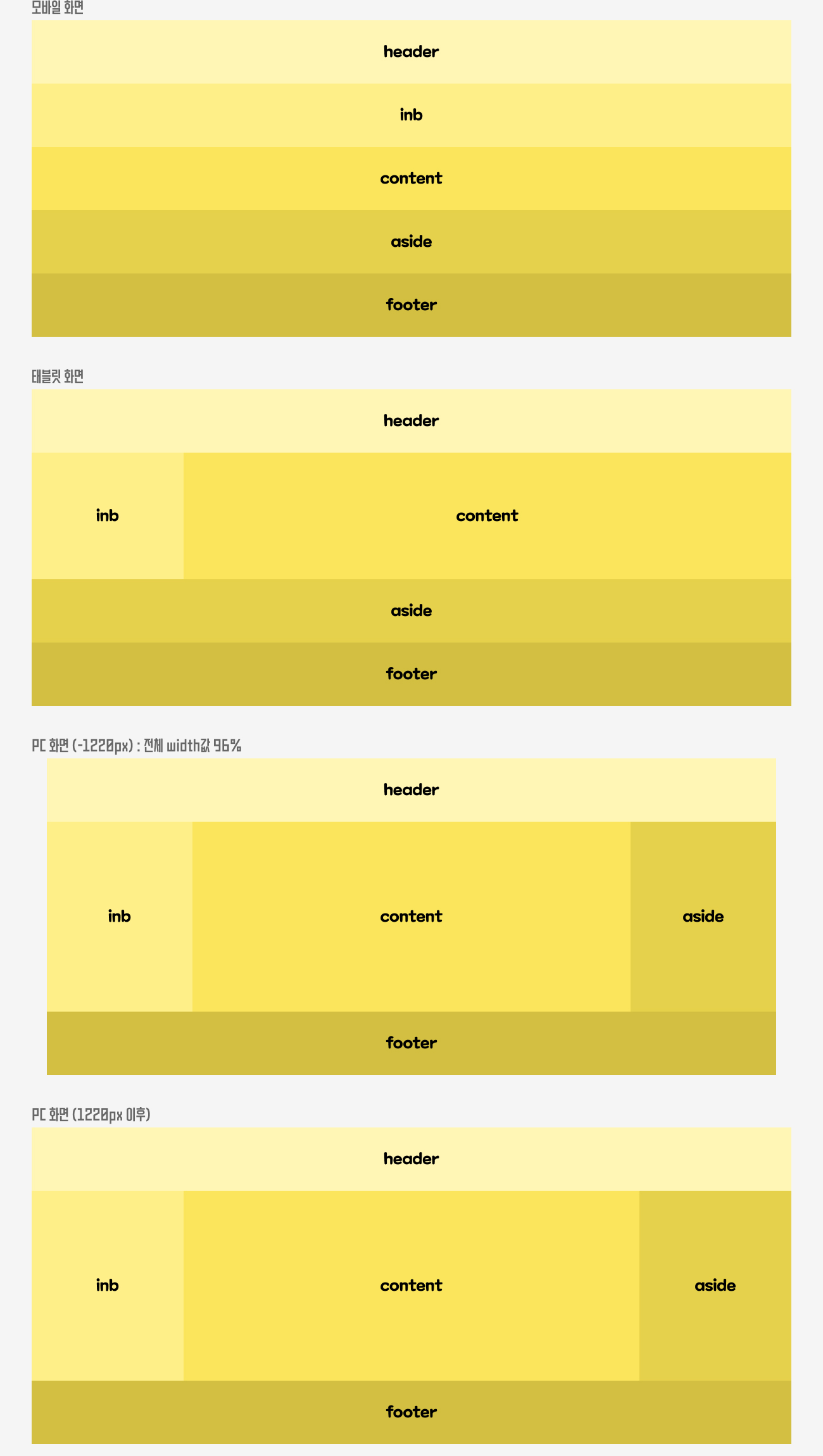 오늘 배운 미디어 쿼리를 이용해서 아래 레이아웃구조를 모바일, 태블릿에서도 볼 수 있는 반응형웹으로 구현해보겠습니다. 전혀 어렵지 않으니 잘 따라와 주세요. 미디어 특성은 min-width를 사용해서 작업하였습니다. min-width를 사용했으므로 기본 css속성은 모바일 버전으로 구성되겠네요.